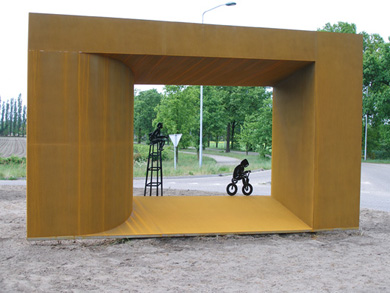 Drie corten stalen objecten van 3 x 5 meter. In elk venster zijn twee